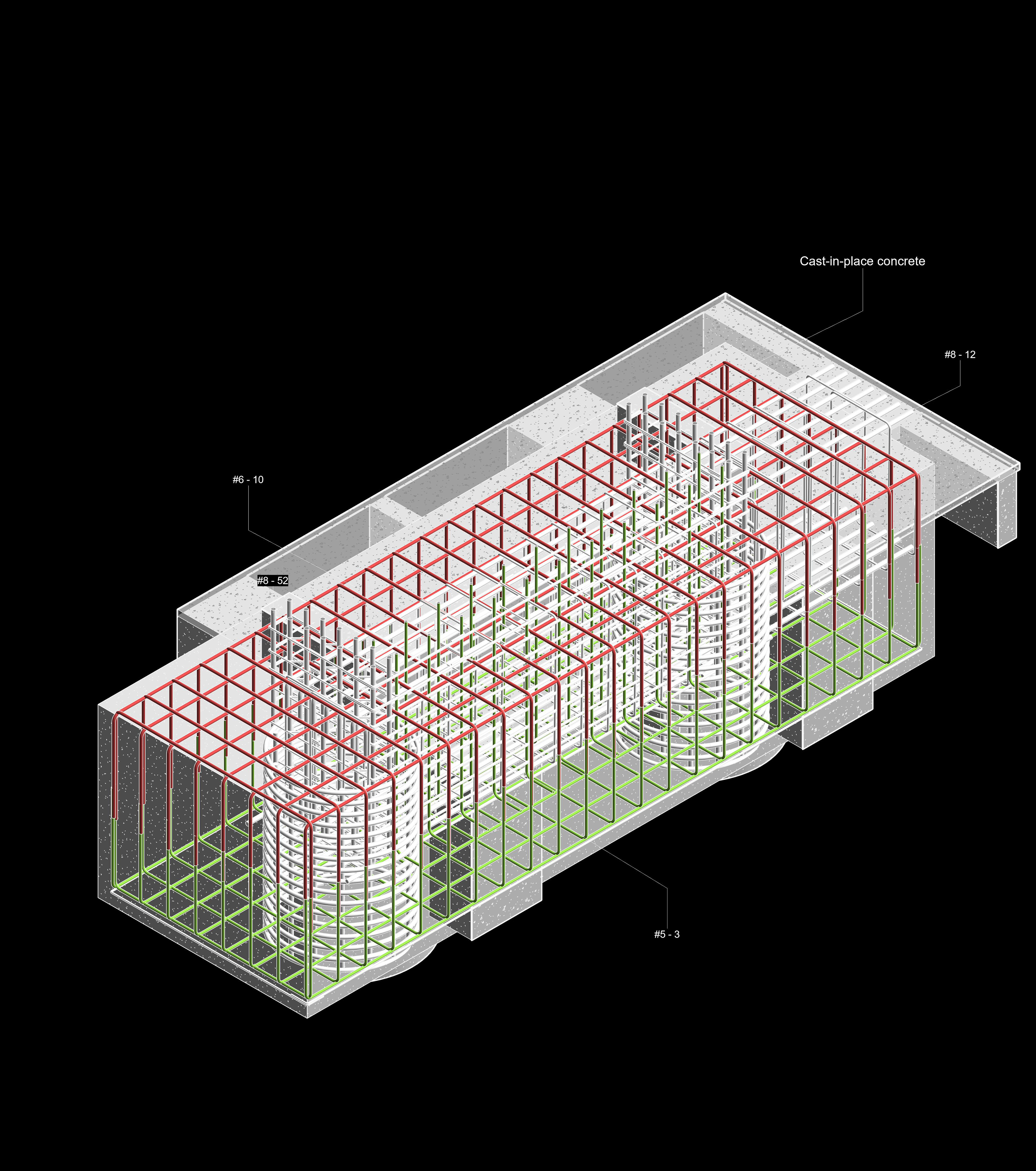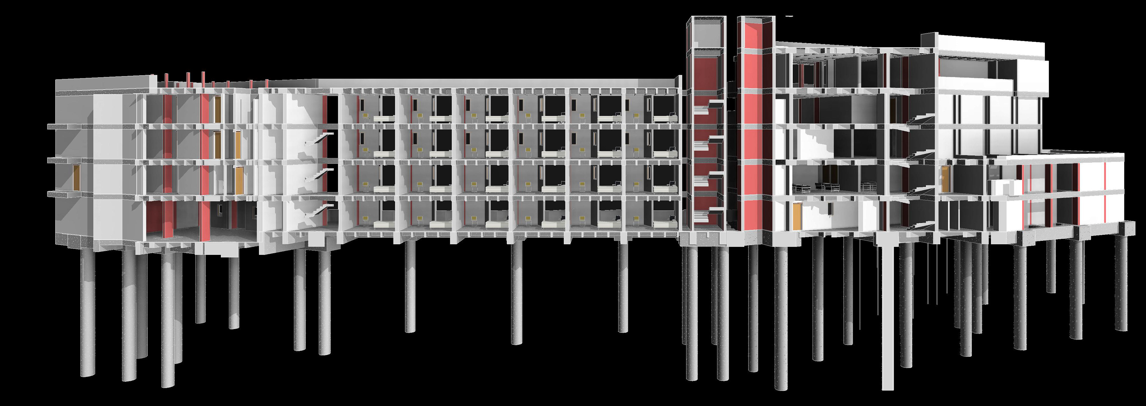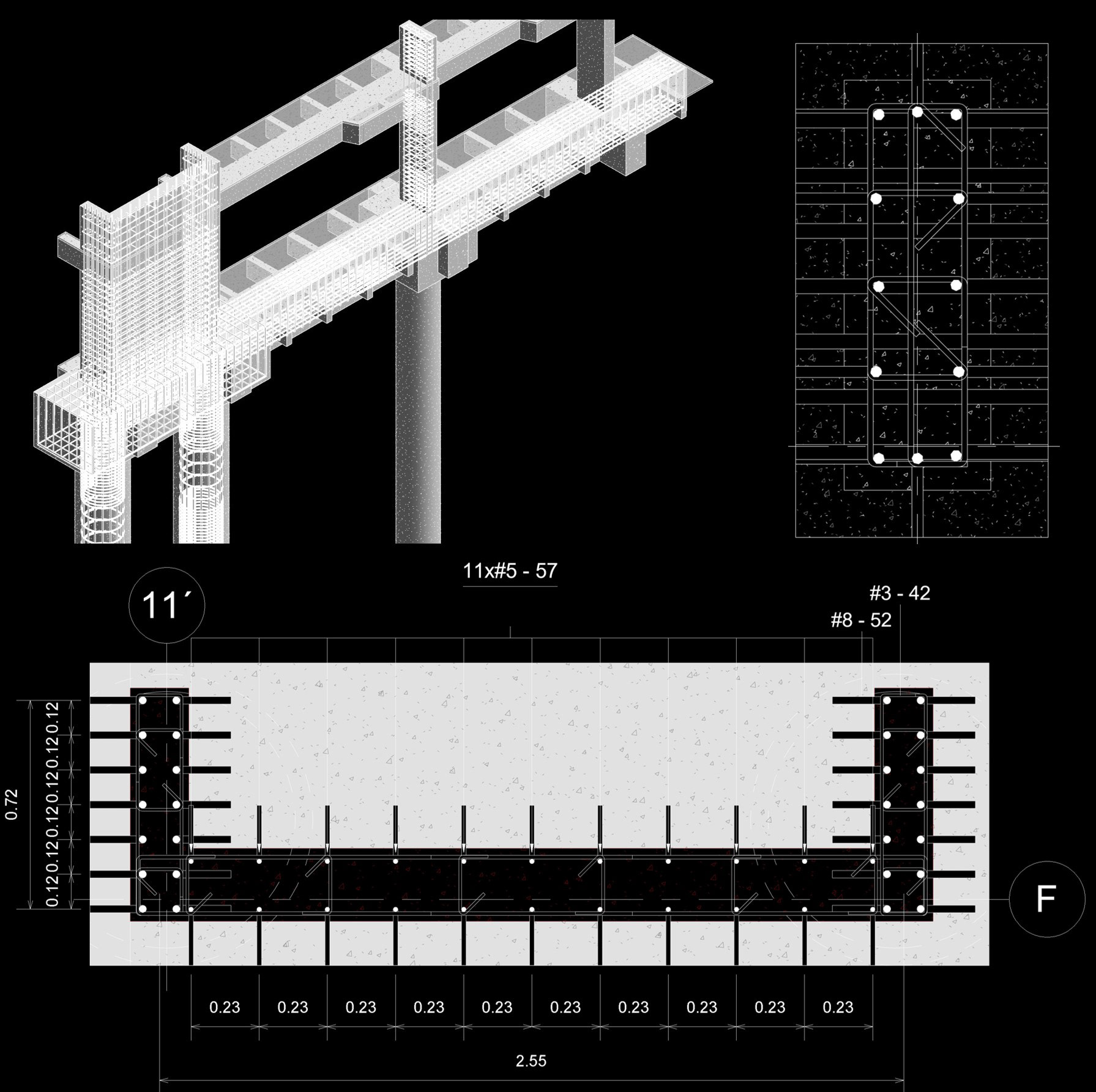 En paralelo, se desarrolló un modelo estructural alineado al arquitectónico. Todas las columnas, vigas y losas estructurales se ubicaron siguiendo los ejes acordados, asegurando que el “esqueleto” del edificio calzara dentro de la arquitectura. Se utilizaron familias de pilares y vigas parametrizadas (principalmente de concreto reforzado, dado el carácter institucional de la construcción). También se incluyeron elementos como cimentaciones y muros estructurales en sótanos si los hubiere. Durante este proceso, fue vital la comunicación constante entre los modelos: por ejemplo, si el modelo ARQ indicaba un espacio de doble altura, el modelo EST debía reflejar vigas perimetrales más robustas o elementos de refuerzo. Cada ajuste estructural (como el ancho de una columna) se coordinó para no invadir espacios arquitectónicos importantes.