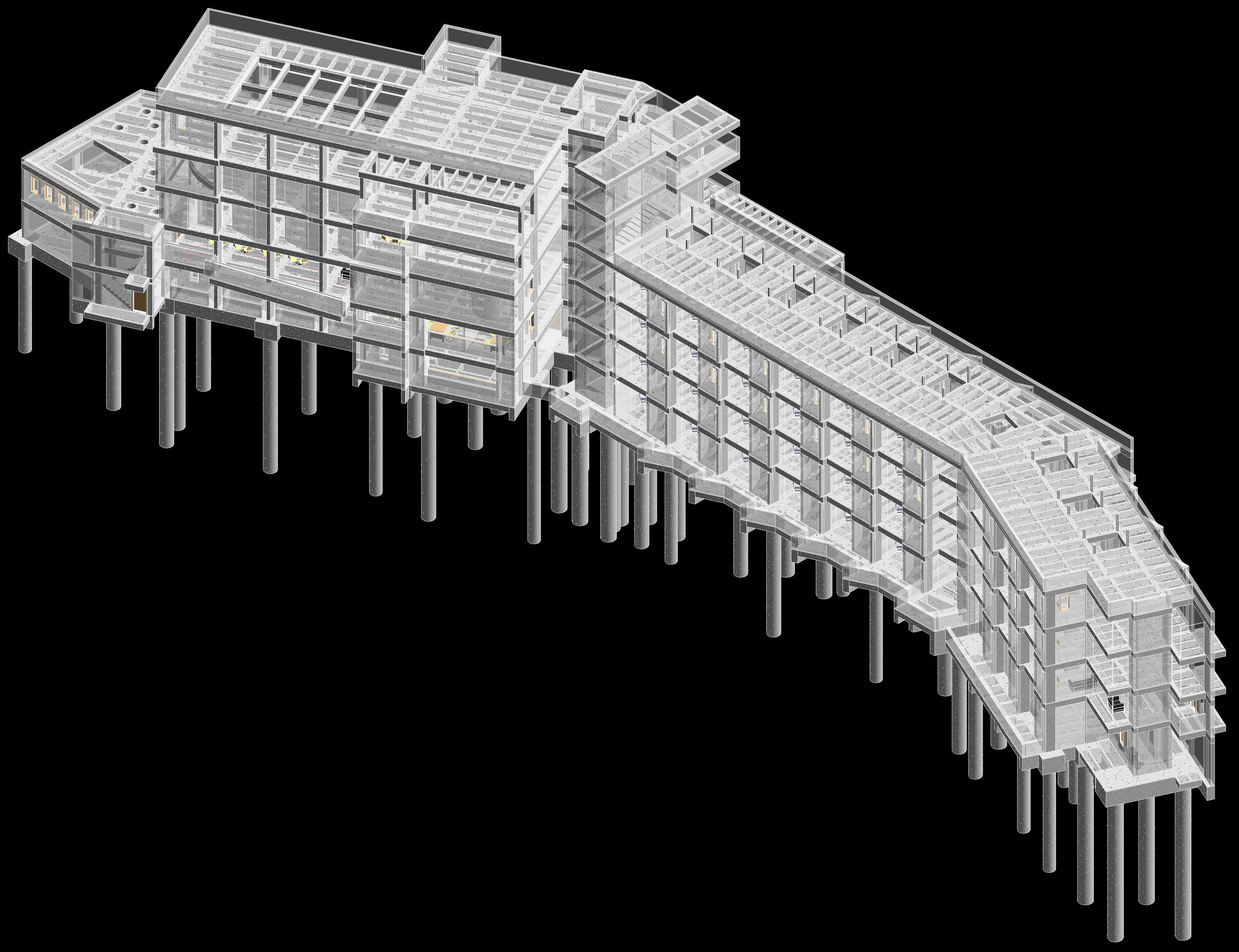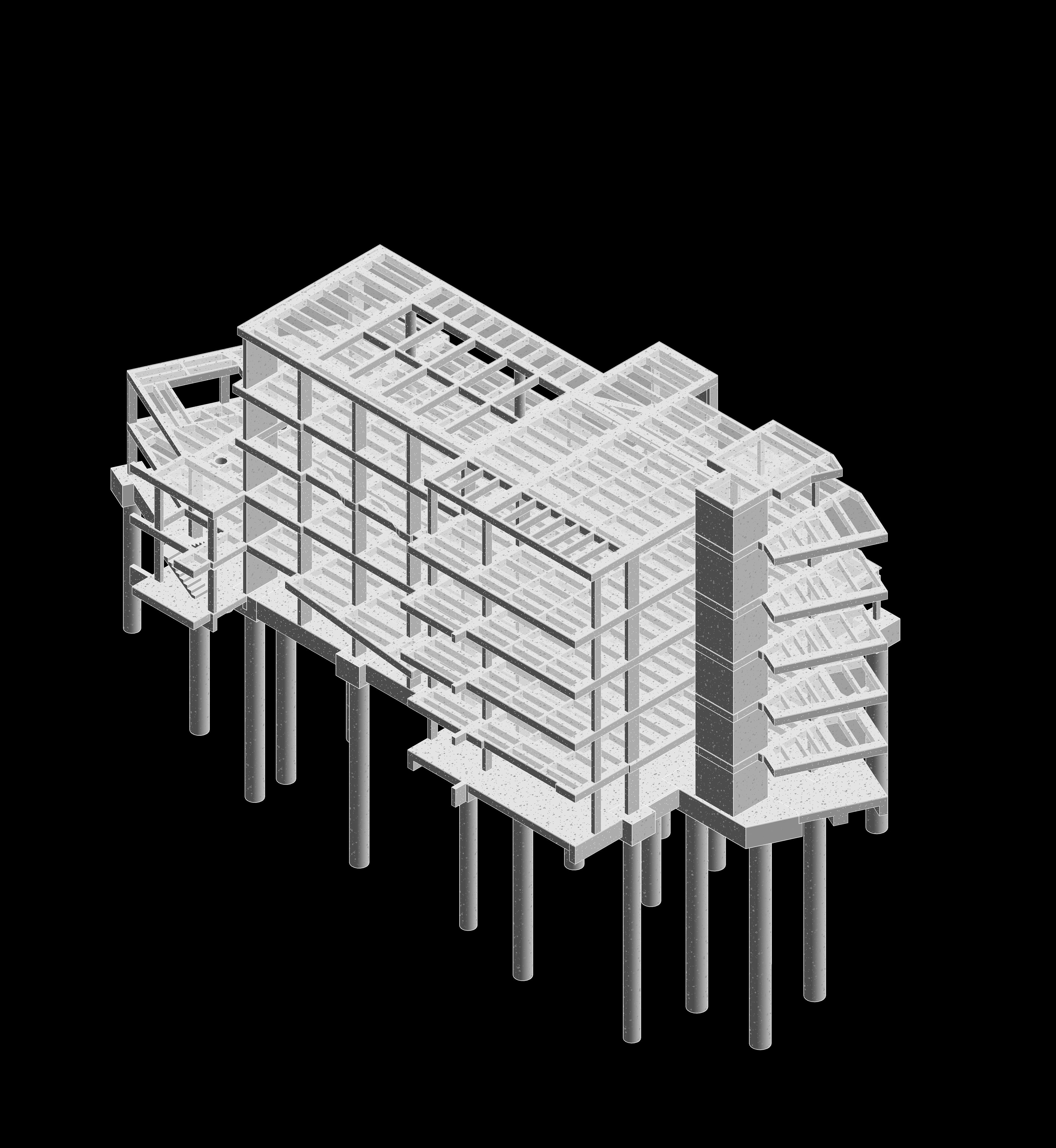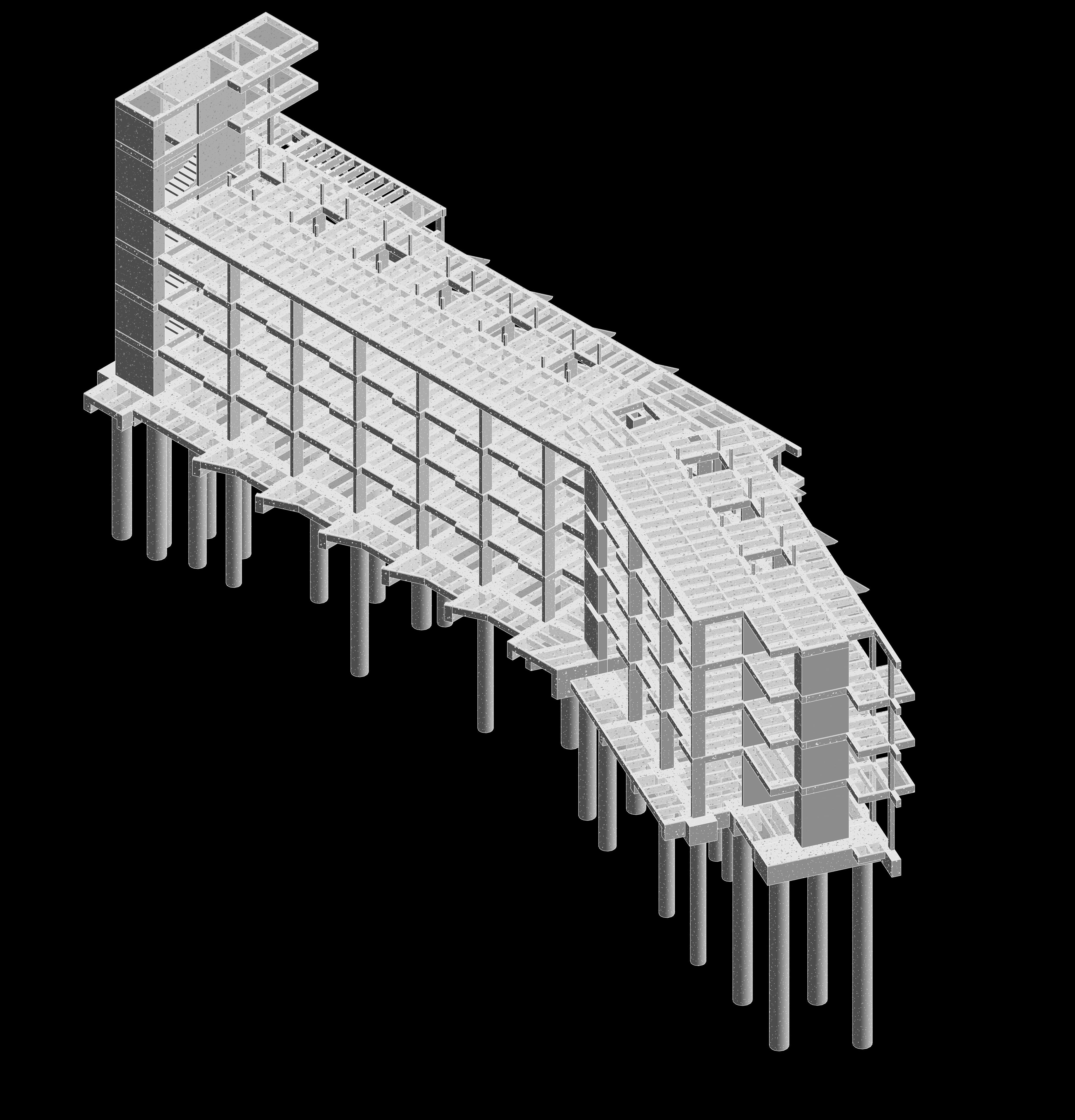 Partiendo de planos base proporcionados, se modeló la arquitectura del edificio: muros portantes y divisorios, losas de piso, cubiertas, ventanas, puertas y acabados principales. Se respetaron las elevaciones y la modulación original; cada nivel fue definido con precisión para reflejar la realidad construida. El modelado arquitectónico capturó no solo la forma (plantas y fachadas), sino también elementos como escaleras, barandillas y muros cortina presentes en la dificación. Un punto crítico fue definir correctamente los ejes y grids del edificio, ya que servirían de referencia común para las demás disciplinas.